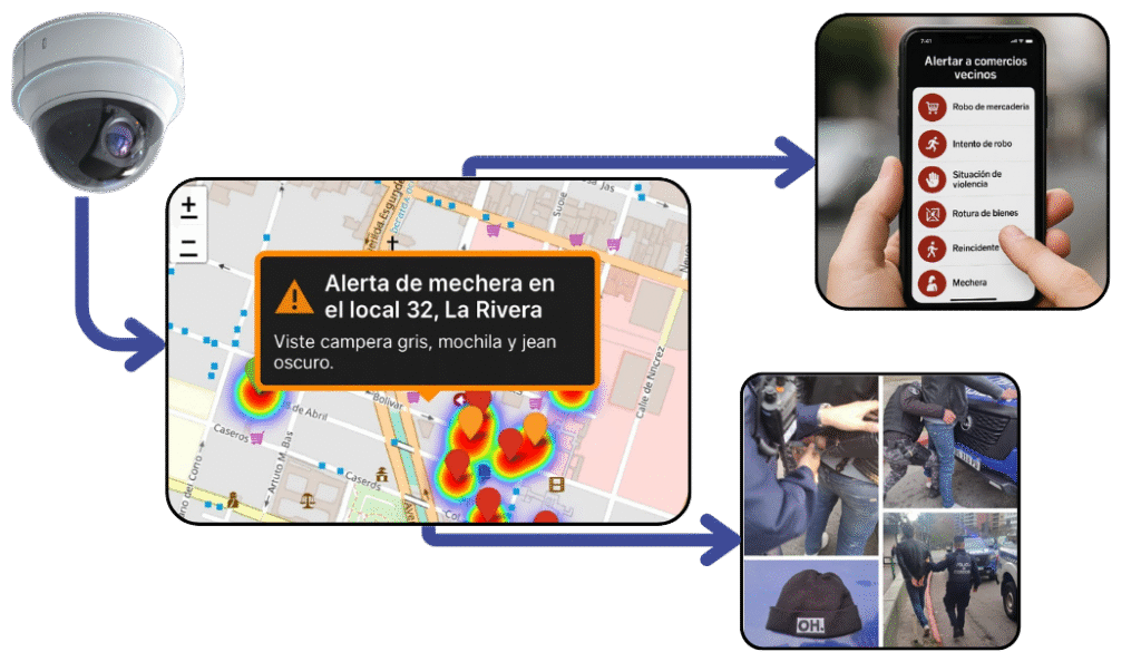 Todos los comercios interconectados, quien reciba un acto de delincuencia pone en alerta al resto y despierta una acción conjunta de identificación y rastreo para evitar nuevos ingresos de la misma persona en nuevas oportunidades. Cuantos más somos nuestro resultado mejora con inteligencia compartida.